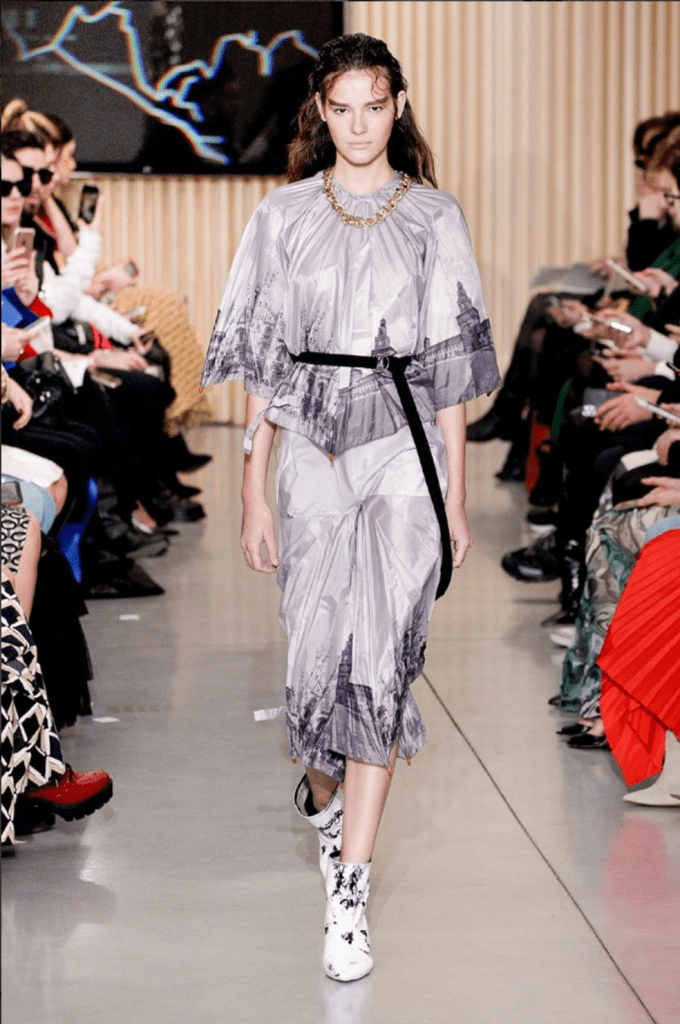 What seemed like an ode to the city of [Milan] was a print of the city’s symbolic Duomo and Castello Sforzesco layered over a silky two-piece look, The nostalgic design entered towards the end of the show at which point the thought occurred if the collection itself wasn’t an ode to the Italian fashion capital.