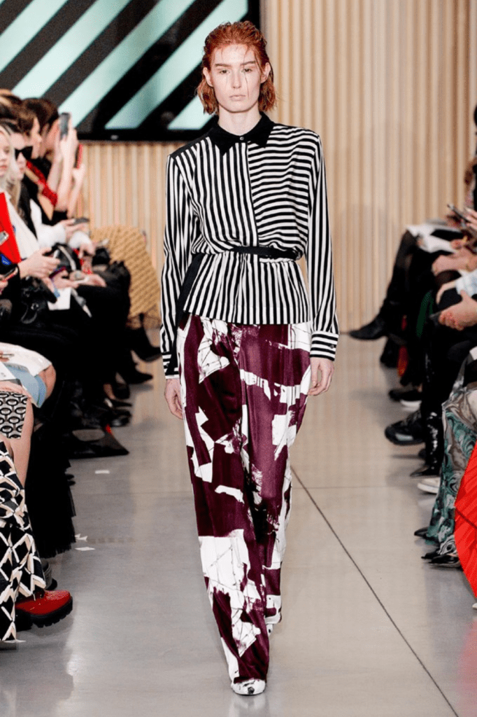 Designed with the intention of being reassembled in a multitude of ways for seasonless wear, the collection balanced qualities of older, more traditional and rather masculine-winter-like fashion with a complimentary-softer, spring-summer side. We found houndstooth wool patterns colliding with bold pastels and neons. Prints of dynamic stripes paired with abstract shapes portraying the look of a sophisticated consultant jetting in and around the fashion capital, while revived vinyls and neoprenes spoke the glam of pop fashionistas. A loose and flowy silhouette could be seen in the many silk garments which featured prints, making up a fair portion of the collection, as well as the sheer dresses and skirts which layered over tops of certain looks. The footwear kept a continuous flow; not straying away from the same cracked-icy, white-and-black print, but altering from boots to heels complimenting some looks better than others.