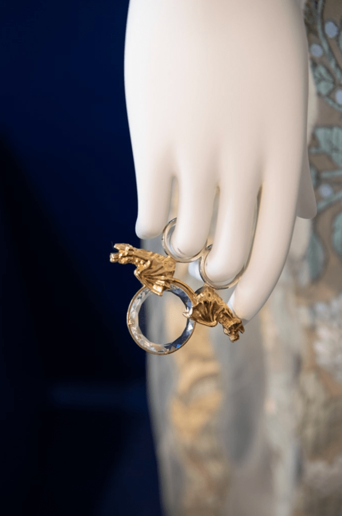Adding an edge to the collection, are the accessories. Jeweled spirit-animals which serve as unique headpieces, bedazzled with swarovskis and made-up-of upcycled crystals stun atop the looks. Blinged-out gargoyle shaped jewelry courtesy of designer Gianni De Benedittis also shine, as fine additions to the hands and wrists.