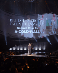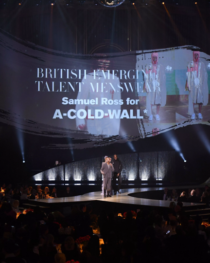 Designer Samuel Ross of A Cold Wall* accepts the British Emerging Talent Menswear award at The British Fashion Awards (2018).
